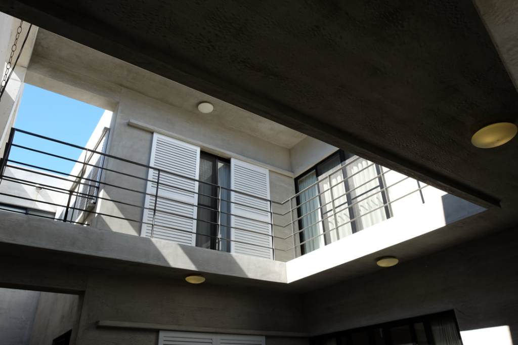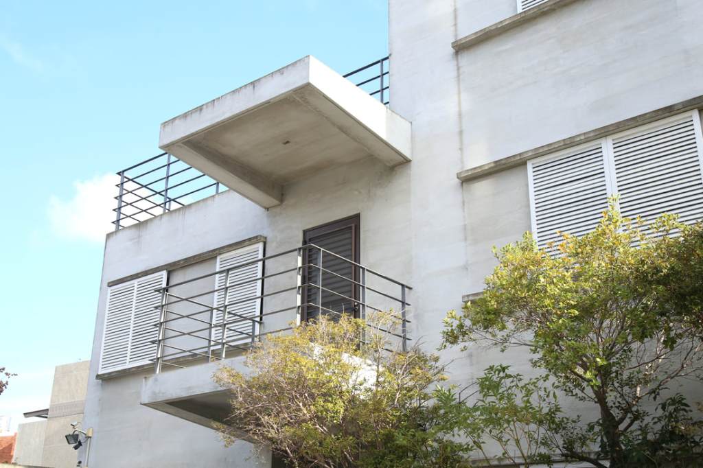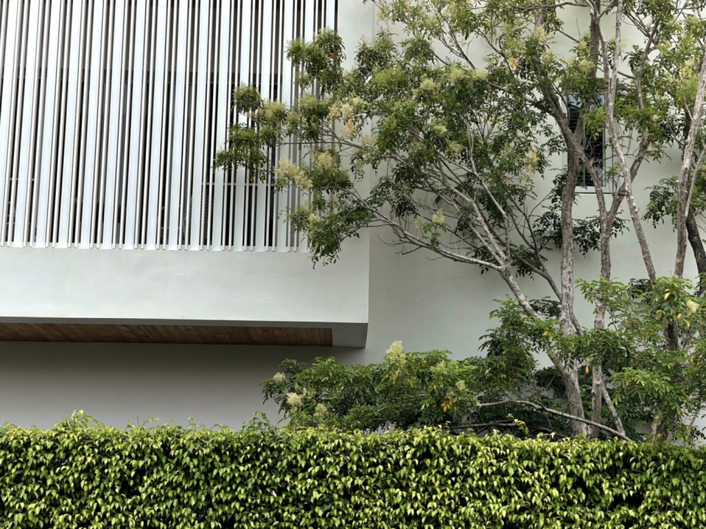 色澤親合的粉光白牆,映著樹影,格柵在白天是遮陽,在夜晚時是透著柔光的篩子,暖暖地散發出家的氣息,大隱於市。